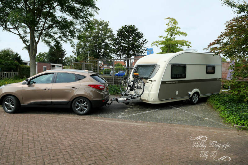 We zijn er klaar voor, caravan hangt achter de auto, bijna alles is in de auto of caravan.