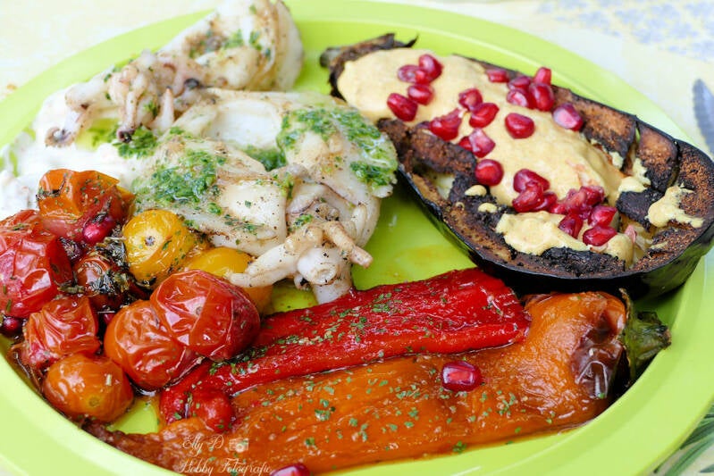 aubergine tomaatjes en puntpaprika met gegrilde sepia gegrild op de cadac